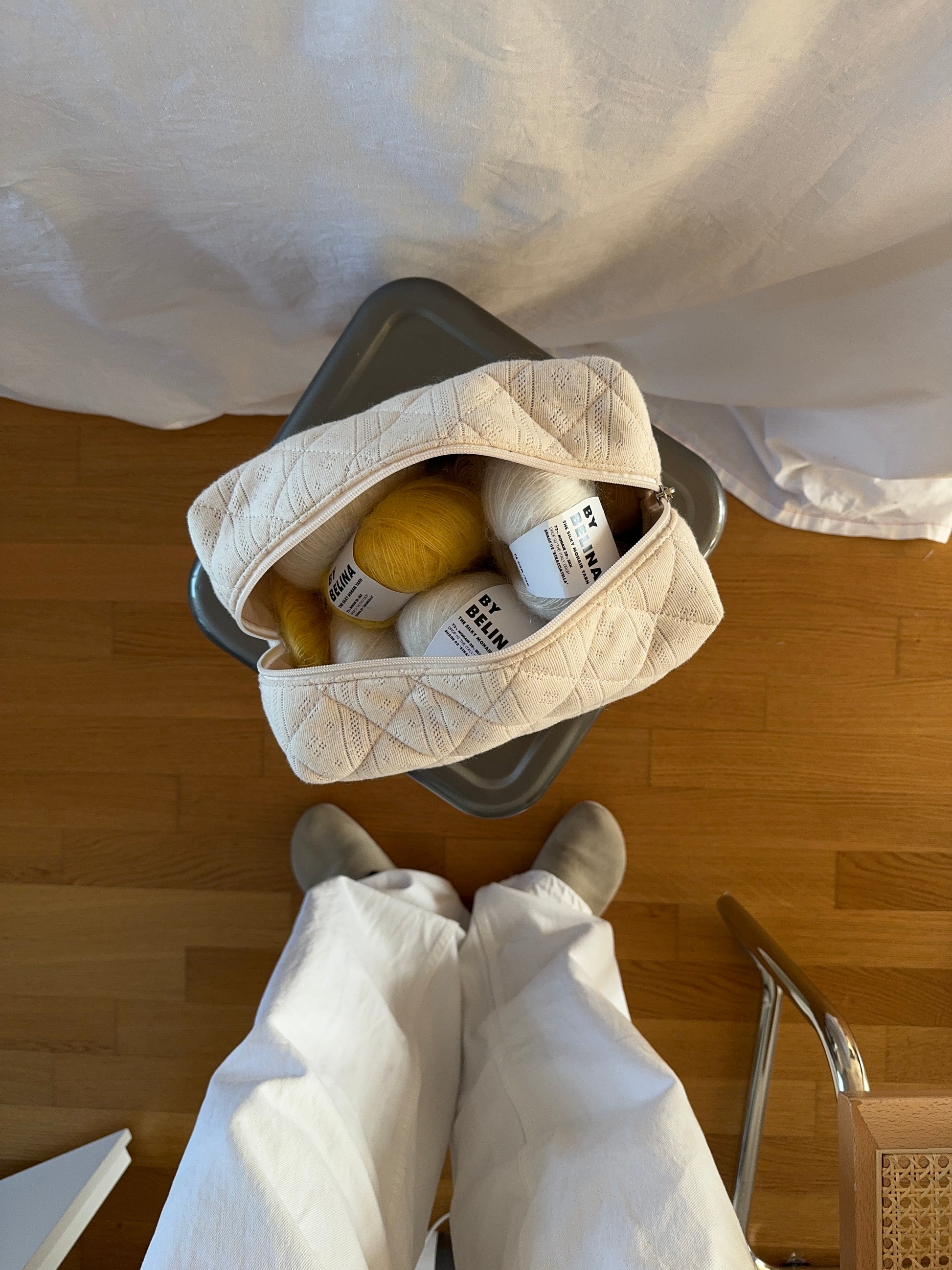 The size is perfect to fit one complete crochet project — it has enough space to fit an A5 pattern and one skein of each current BY BELINA yarn.